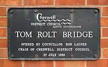 Plaque attached to retaining wall of Tom Rolt Bridge on mooring side of canal
