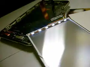 An Apple iPod Touch disassembled to show the array of white-edge LEDs powered on with the device