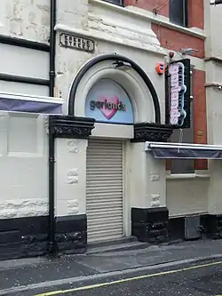 By 1975, most of the bars that had provided a safe haven for so long around Queen Square had been demolished to make way for the new St. John's Shopping Centre, Roe Street Gyratory and bus station.[45] The Bar Royal on Wood Street had become the 'place to be'.[46] Guests there were heavily vetted on arrival by its owner Sadie and the main door was bolted as people entered. The bar became a hive of activity where students mixed with dockers and glamorous transvestites and transsexuals mixed harmoniously with lesbians and gay men. By the close of the decade, the various groups had separated as heterosexual 'New Romantics' had begun to take over. After a brief close, re-opening and boycott due to rampant misogyny, the bar finally closed when Sadie died in the late 1980s.[47][48]