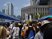 The Seoul Queer Culture Festival, also known as the "Korea Queer Culture Festival" or simply "Seoul Pride", is the largest LGBT event in the country. It was first held in 2000 when only 50 attended and turnout has increased every year since then. In 2015, following protests by conservative Christian groups, the Seoul Metropolitan Police Agency banned the event citing public safety concerns and traffic disruption as the reasons.[78][79] The decision was overturned by the Seoul Administrative Court, allowing the parade to take place, which saw around 20,000 people participating.[80][81] In 2016, there were 50,000 attendees. In July 2017, an estimated 85,000 people (according to the organizers) marched in the streets of Seoul in support of LGBT rights.[82] Ahead of the 2018 event, around 220,000 people signed an online petition demanding that officials act to prevent the festival from taking place.[83][84][85][86] However, the 2018 Seoul Pride parade took place and was attended by an estimated 120,000 people.[87] In July 2019, conservative Christian groups again tried to block the festival, arguing that it "would be harmful to children and it would infringe on their rights". A court rejected their application as nonsensical.[88] Days later, the 20th edition of the festival was held with approximately 150,000 participants.[89][90]