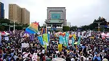 The first Taiwan Pride was held in Taipei in 2003. By 2015, when the event was attended by 80,000 participants, it had become the second-largest LGBT pride in Asia, behind Tel Aviv Pride in Israel, which has led many to refer to Taiwan as one of the most liberal countries in Asia as well.[8] By 2019, attendance had grown to 170,000 participants.[9][10]