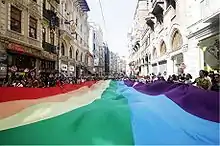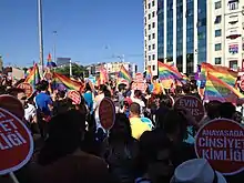 On 30 June 2013, Istanbul pride parade attracted almost 100,000 people.[13] The protesters were joined by Gezi Park protesters, making the 2013 Istanbul Pride the biggest pride event ever held in Turkey.[14] The 2014 Istanbul pride attracted more than 100,000 people. The 2015, 2016, 2017, and 2018 pride parades were banned by local authorities, and participants were faced with police attacks. In June 2013, the first Izmir Pride took place with 2,000 participants.[15] On 3 June 2018, the 6th Izmir Pride Parade peacefully took place with over 50,000 participants.[16] Another pride took place in Antalya.[17] Politicians from the main opposition party, CHP and another opposition party, BDP also lent their support to the demonstration.[18] The pride march in Istanbul does not receive any support of the municipality or the government.[19][20]