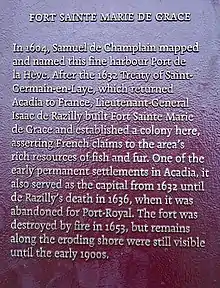 La Hève was the capital of Acadia from 1632, when Isaac de Razilly settled on a point of land at the mouth of the LaHave River, until his sudden death in 1635. Razilly established a colony of 300 and built Fort Ste. Marie de Grace.[6] Razilly reported that the fort was capable of standing against all enemy action, and that he had the military supplies necessary to withstand a six-month siege. There was also a chapel, a store and houses for the workmen in the village. Within twelve months of Razilly's arrival, La Have was a thriving trading post, the centre for a small farming community in the area, and a major port of call for the large fishing fleet. At one point there were five hundred transient fishermen in the settlement.[7] Upon Razilly's death in 1635, the new Governor Charles de Menou d'Aulnay moved the Acadians from La Hève to Port Royal, Nova Scotia, which had been given up by the Scottish also in 1632.[8] His wife Jeanne Motin, "daughter of Louis Motin, Sieur de Courcelles, who in addition to owning shares in the Razilly-Condonnier Company, was the controller of salt stores located at one of France's colonies, perhaps in the Caribbean", was of great strategic value in the subsequent struggle with La Tour. Ironically, she became Lady de La Tour in 1653 after Aulnay's death and La Tour's triumphant return with Letters Patent as governor of Acadia. Nicolas Denys and his brother Simon, who had come over with Razilly, in 1632, set up a "wood working plant" near present-day Riverport, Nova Scotia and a fishing station at Port Rossignol (now Liverpool, Nova Scotia). They stayed neutral in the war between Aulnay (at Port Royal) and La Tour (at Fort La Tour on the Saint John River).