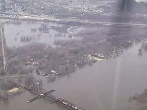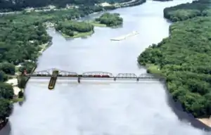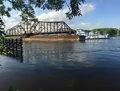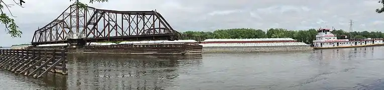 The La Crosse Rail Bridge is a swing bridge that spans the Mississippi River between La Crescent, Minnesota and La Crosse, Wisconsin. The first bridge in this location initially was designed and ready to build by June 1876, and was completed in November 1876 by the Milwaukee and St. Paul Railway, a predecessor of the Chicago, Milwaukee, St. Paul and Pacific Railroad.[2][3] It was later replaced in 1902.[4] It is at the Western end of the Canadian Pacific Railway Tomah Subdivision. Amtrak's Empire Builder crosses this bridge.