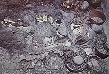 Another item found tucked in with two of the bodies was barkcloth, a versatile material made from the bark of certain trees. The male corpse was widely covered in dark brown strips of barkcloth about 3–4 cm wide, which were inside the strings but outside of the hair tufts, whilst one of the two women also had similar strips, but less than the man.[11] Grieder suspected that the inclusion of this material was because those burying the dead thought that bark cloth had "spiritual power",[11] a widespread belief that was found across the Pre-Columbian Americas.[12]