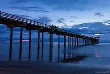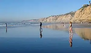 The beach is approximately one mile (1.6 km) long and stretches from the sea cliffs just north of La Jolla Cove to Black's Beach south of Torrey Pines State Park. Shores meets the Scripps Institution of Oceanography campus and Kellogg Park, encompasses the Scripps Pier and borders the San Diego-La Jolla Underwater Park Ecological Reserve to the south. The beach is a popular launch point for kayakers as it is the only beach boat launch in the San Diego city limits.[1] The beach is also popular among stand up paddlers, swimmers and snorkelers. The southern end of the beach is especially rich with wildlife. During certain times of year, leopard sharks, diamond stingrays, round stingrays, and species of guitarfish are common. Green sea turtles and broadnose sevengill sharks are elusive but can be found farther offshore.