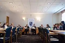The university is led by its board of trustees headed by a president and chair.[8] The president serves one or more 5–year terms.[9] As of 2022, there have been 29 Presidents. Students are represented through a democratically elected student government. The La Salle Students' Government Association sits on numerous committees led by staff and administrators, including some board meetings.[10] La Salle's student government is a founding member of the American Student Government Association.[11] The president's office, formerly located in the historic Peale House, is now in College Hall, the former business school building.