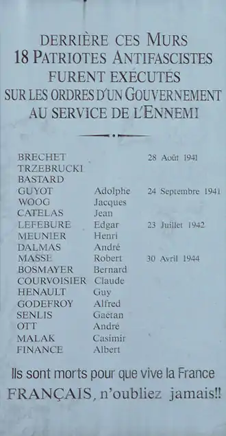 During the Occupation of France, in addition to common law criminals, there were also executions of 18 Resistance fighters and communists. Nine of them were guillotined between August 1941 and July 1942. The other nine were shot on 30 April 1944. A plaque affixed to the wall of the prison at the corner of Rue Jean-Dolent and Rue de la La Santé recalls their tragic end.