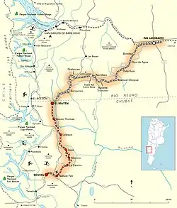 The Trochita railway is 402 km in length and runs through the foothills of the Andes between Esquel and El Maitén in Chubut Province and Ingeniero Jacobacci in Río Negro Province,[1] originally it was part of Ferrocarriles Patagónicos, a network of railways in southern Argentina. Nowadays, with its original character largely unchanged, it operates as a heritage railway and was made internationally famous by the 1978 Paul Theroux book The Old Patagonian Express, which described it as the railway almost at the end of the world.[2] Theroux had sought to ride trains as far as possible into southern Argentina but did not include in his adventures the several railroads which were further south than Esquel, presumably because they were not considered operational or with sufficient connection to larger lines.