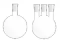 - Multiple neck flasks, which can have two to five, and less commonly, six necks, each topped by ground glass connections which are used in more complex reactions that require the controlled mixing of multiple reagents.