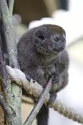 The Lac Alaotra bamboo lemur (Hapalemur alaotrensis), also known as the Lac Alaotra gentle lemur, Alaotran bamboo lemur, Alaotran gentle lemur, Alaotra reed lemur,[4] or locally as the bandro, is a bamboo lemur. It is endemic to the reed beds in and around Lac Alaotra, in northeast Madagascar. It is about 40 cm (16 in) long, with a similar length tail, and is a brownish-gray colour. It is the only bamboo lemur to live in and feed on papyrus reeds, and other reeds and grasses, and some authorities argue that it should be regarded as a subspecies of the eastern lesser bamboo lemur (Hapalemur griseus). The population of this lemur has been declining because of habitat destruction and the International Union for Conservation of Nature has rated it as being "critically endangered".
