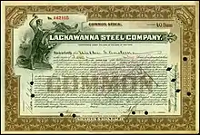 The creation of U.S. Steel in 1901 supplanted Lackawanna Steel as the country's largest steel manufacturer. A number of the so-called "independent" steel companies considered merger over the next two decades as a response to U.S. Steel's formation. In late 1915, Lackawanna Steel nearly consummated a merger with the Cambria Steel Company, Newport News Shipbuilding and Drydock Company, Youngstown Sheet and Tube, and Inland Steel.[37] But despite the agreement of the steel companies, federal regulators, and others, the banks carrying the debt for these companies refused to approve the merger and the plan was dropped.[38] The company's financial status varied considerably in the late 1910s. The stock set new highs and the company doubled its profits in 1917 and the first half of 1918,[39] but in late 1918 and throughout 1919 the company fell on hard financial times.[40]
