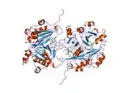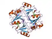 ![]() Ribbon diagram of human glyoxalase I with its catalytic zinc ions shown as two purple spheres. An inhibitor, S-hexylglutathione, is shown as a space-filling model; the green, red, blue and yellow spheres correspond to carbon, oxygen, nitrogen and sulfur atoms, respectively. | |||||||||