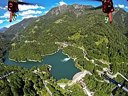 Lago di Palagnedra is a manmade lake at Palagnedra, Ticino, Switzerland. The reservoir has a capacity of 4,260,000 m3 (3,450 acre⋅ft) and a surface area of 25 ha (62 acres). The dam on the Melezza river was completed in 1952, height 72 m (236 ft).