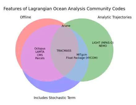 While small scale Lagrangian analysis codes have been written for many individual research projects, there exists a smaller number of community codes that can implement Lagrangian ocean models on a global scale.[1] The differences between 10 such community codes are illustrated in the venn diagram, where they are grouped in terms of whether they are offline, whether they include a stochastic term to model diffusion or small-scale turbulent mixing, and whether they compute trajectories analytically. All of the codes in the diagram that lie outside of the analytic trajectories circle employ explicit integration methods to compute the trajectories. Ariane, for example, is a code that runs offline, calculates trajectories with the analytic streamtube method and does not model diffusive effects.[1][3] By contrast, Parcels computes particle trajectories through explicit time-stepping and can include stochastic terms if the user desires; it is also offline.[1][14] A caveat to this is that Parcels' integration framework is customisable, and could be reprogrammed to instead use the analytical method to calculate trajectories.[14]