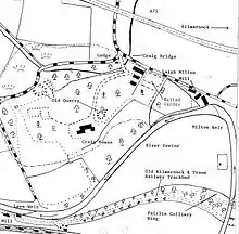 Gatehead railway station was situated nearby, in the village of that name. It closed on 3 March 1969. Gatehead is likely to be named from the turnpike road and the tool bar. A 'Gatehead Toll Bar' is still marked on the road down to Laigh Milton mill and the Craig house estate on the 1860 OS map.