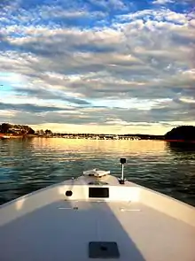 Lake Hartwell is a man-made reservoir bordering Georgia and South Carolina and encompassing parts of the Savannah, Tugaloo, and Seneca rivers. Lake Hartwell is one of the southeast's largest recreation lakes. The lake was created by the construction of the Hartwell Dam, completed in 1962 and located on the Savannah River seven miles (11 km) below the point at which the Tugaloo and Seneca Rivers join to form the Savannah. Extending 49 miles (79 km) up the Tugaloo and 45 miles (72 km) up the Seneca at normal pool elevation, the lake comprises nearly 56,000 acres (230 km²) of water with a shoreline of 962 miles (1,548 km). The entire Hartwell "Project" contains 76,450 acres (309 km²) of land and water. I-85 bisects Hartwell Lake and makes the area easily accessible to visitors.[3]