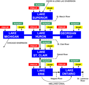 The largest inflow to the system is the St. Mary's River from Lake Superior, and the main outflow is the St. Clair River toward Lake Erie; both lie in the Lake Huron basin.[14][3] The combined effects of seiches (resonant standing waves)[15] and of differing weather conditions (atmospheric pressure, wind)[14] over each basin act to drive water either way through the Straits on a variety of characteristic timescales, at amounts sometimes exceeding 75,000 m3/s (2,600,000 cu ft/s) for several hours in either direction.[15] However, the long-term average flow through the Straits is eastwards at 1,500–2,000 m3/s (53,000–71,000 cu ft/s), toward the outlet of the St. Clair River.[15] Flows into the system from Lake Superior are controlled by the bi-national Lake Superior Board of Control through the operation of locks and canals.[16]