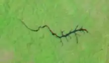 Lake Muhazi (Kinyarwanda: Ikiyaga cya Muhazi) is a long thin shallow lake in the east of Rwanda. The bulk of the lake lies in the Eastern Province, with the western end forming the border between the Northern and Kigali Provinces.[2] It is a flooded valley lake, lying predominantly in an east to west direction, but with numerous offshoots in a north to south direction, formerly the location of tributaries.[3] The lake has a concrete dam at the western end, constructed in 1999 to replace an earth dam which had existed since time immemorial.[1] The lake empties into the Nyabugogo River, which flows southwards to Kigali where it meets the Nyabarongo River, part of the upper Nile.[4]