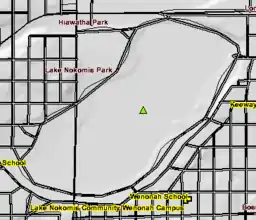 Lake Nokomis is one of several lakes in Minneapolis, Minnesota, United States. The lake was previously named Lake Amelia in honor of Captain George Gooding's daughter, Amelia, in 1819. Its current name was adopted in 1910 to honor Nokomis, grandmother of Hiawatha.[1] It is located in the southern part of the city, west of the Mississippi River and south of Lake Hiawatha. The lake is oval in shape, with a long axis running southwest to northeast. Two pathways circle the lake, a 2.7-mile (4.3 km) pedestrian trail and a 2.8-mile (4.5 km) bicycle trail.[2] Because the lower part of the lake is crossed by Cedar Avenue running north-south, the impression from the ground is that the lake is shaped like an L. The lake has an area of 204 acres (0.83 km2).