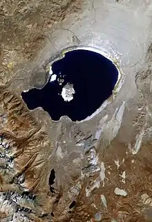 Lake Russell is a former lake stage of Mono Lake. It was named in honour of Israel Russell, but is also known as Lake Mono in contrast to the present-day lake.[2] This lake was larger than present-day Mono Lake and occasionally overflowed first into the East Walker River and later into the Owens River. During its existence, glaciers from the Sierra Nevada reached until its shore.
