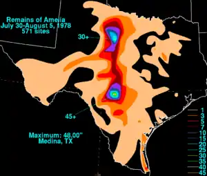 Two days after recording its third-lowest level, the lake surged to its second-highest level ever. On August 5, 1978, the water in Lake Stamford was 5.38 feet (1.64 m) above the spillway. This represents an increase over 15.2 feet (4.6 m) in less than 48 hours, the lake's fastest-ever change in elevation.[12] In fact, the rise was so fast. it took some three hours for the lake to simply fill to capacity by increasing almost 10 feet (3.0 m).[5] This was due to remnants of Tropical Storm Amelia. Though Amelia was weak and poorly organized, as it dissipated over Texas, it cause severe flooding.