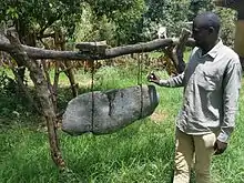A local tour guide demonstrates how a stone is struck to signal meal times at a monastery on Zege Peninsula