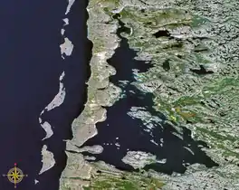 The western shore is guarded by the steep ramparts of sedimentary rock that rise abruptly out of the brackish waters. This unusual coastal relief of asymmetrical hills are the Hudsonian Cuestas and the highest system of cuestas found in Quebec.[6] There is only one narrow breach in these fortifications at the extreme southwest end, called "Le Goulet" (French meaning "narrows" or "bottleneck"), which is a cataclinal valley 5 kilometres (3.1 mi) long, 300 to 600 metres (980 to 1,970 ft) wide and fringed by cliffs 200 metres (660 ft) high.[6] A large volume of water surges through it with the rise and fall of the tides, creating water level differences of about 0.5 metres (1.6 ft).[1] Consequently, this passage does not freeze in the winter.