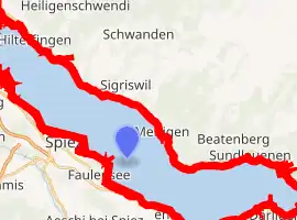 Lake Thun (German: Thunersee) is an Alpine lake in the Bernese Oberland in Switzerland named after the city of Thun, on its northern shore. At 48.3 km2 (18.6 sq mi) in surface area, it is the largest Swiss lake entirely within a single canton.