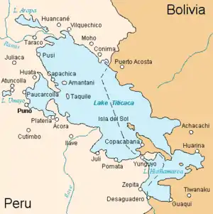 Locally, the lake goes by several names. The southeast quarter of the lake is separate from the main body (connected only by the Strait of Tiquina) and the Bolivians call it Lago Huiñaymarca (also Wiñay Marka, which in Aymara means the Eternal City) and the larger part Lago Chucuito. The large lake also is occasionally referred to as Lago Mayor, and the small lake as Lago Menor.[26] In Peru, these smaller and larger parts are referred to as Lago Pequeño and Lago Grande, respectively.[14]
