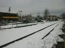 Lake View station's layout consisted of two asphalt platforms in between three tracks, one located between two northbound tracks, and one next to the station depot, built along Railway Avenue just north of Crooks Avenue in Paterson.[2] The station building itself was a 37 ft × 16 ft (11.3 m × 4.9 m) building with a shingled roof.[3] The track was laced with intertrack fencing to prevent people from crossing the tracks. Parking was accessible from Railway Avenue and located along the station's eastbound platform. The station itself was 15 miles (24 km) from New York City's Chambers Street Ferry Terminal,[4] where people caught ferries to Jersey City and the Erie Railroad trains.[5]