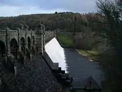 Thomas Hawksley was appointed as engineer-in-chief and prepared the design for a stone dam.[3] Dam construction with great blocks of Welsh slate started in 1881 and was completed in 1888. Hawksley resigned in 1885 because of a conflict with George Deacon who was appointed as joint engineer. The dam was the first large stone-built dam in the United Kingdom and cost £620,000 (equivalent to £70 million in 2019[4]). Earlier dams in Britain had been built using great earth embankments to hold back the water. In 1889, shortly after completion, the lake was stocked with 400,000 Loch Leven trout.