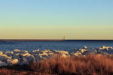 View of the lighthouse and of Lake Michigan from Lakeshore State Park