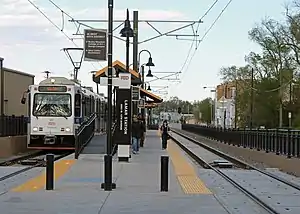 Lamar is an at-grade light rail station on the W Line of the RTD Rail system. It is located near the intersection of West 13th Avenue and Lamar Street, after which the station is named, in Lakewood, Colorado.[1] The station is located within Lakewood's 40 West Arts District, not far from the businesses on West Colfax Avenue and about 0.7 miles (1.1 km) from the campus of the Rocky Mountain College of Art and Design.