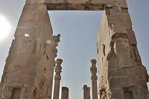 The colossal entrance figures were often followed by a hero grasping a wriggling lion, also colossal in scale and in high relief. In the palace of Sargon II at Dur-Sharrukin, a group of at least seven lamassu and two such heroes with lions surrounded the entrance to the "throne room", "a concentration of figures which produced an overwhelming impression of power."[14] They also appear on cylinder seals. Notable examples include those at the Gate of All Nations at Persepolis in Iran, the British Museum in London, the Louvre in Paris, the National Museum of Iraq in Baghdad, the Metropolitan Museum of Art in New York, and the University of Chicago Oriental Institute. Several examples left in situ in northern Iraq were destroyed in the 2010s by the Islamic State of Iraq and the Levant when they occupied the area, as were those in the Mosul Museum.