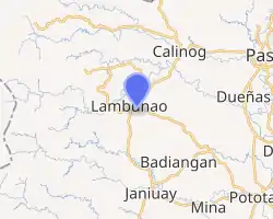 Lambunao, officially the Municipality of Lambunao (Hiligaynon: Banwa sang Lambunao, Kinaray-a: Banwa kang Lambunao, Tagalog: Bayan ng Lambunao), is a 1st class municipality in the province of Iloilo, Philippines. According to the 2020 census, it has a population of 81,236 people. [3]