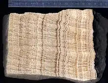 In geology, lamination is a small-scale sequence of fine layers (laminae; singular: lamina) that occurs in sedimentary rocks. Laminae are normally smaller and less pronounced than bedding. Lamination is often regarded as planar structures one centimetre or less in thickness, whereas bedding layers are greater than one centimetre.[1] However, structures from several millimetres to many centimetres have been described as laminae.[2] A single sedimentary rock can have both laminae and beds.
