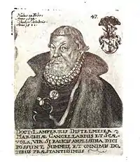 Lampert Distelmeyer, or Lamprecht Distelmeyer (22 February 1522, Leipzig - 12 October 1588, Berlin) was a German jurist and Chancellor of Mark Brandenburg.