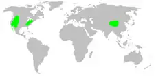 Lampshade spiders, family Hypochilidae, are among the most primitive of araneomorph spiders. There are two genera and twelve species currently recognized. Like mygalomorphs, most hypochilids have two pairs of book lungs, but like araneomorphs they have intersecting fangs, with the exception of some species which have chelicerae in an angle that is neither orthognathous or labidognathous.[1] These long-legged spiders build typical "lampshade" style webs under overhangs and in caves. In the United States the fauna is primarily associated with the Appalachian, Rocky and California Mountains. Ten of the known species are found in these ranges, all in the genus Hypochilus. The genus Ectatosticta is found in China.