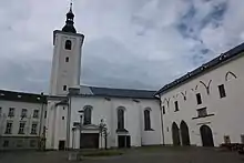 The original monastery from the 14th century was rebuilt into a Renaissance castle. The reconstruction was completed in 1601. From the 1650s to 1716, it was rebuilt to its current appearance. Today it houses the town museum.[7] The Church of Saint Wenceslaus is adjacent to the castle and stood here before the founding of the monastery. It was first mentioned in 1350 and originally was consecrated to the Virgin Mary. It was reconstructed several times, the tower was added in 1768.[8]