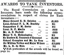 - Awards to Tank Inventors: Royal Commission's Report: Mr. Churchill's "Driving Force", The Times, No.42269, (Friday, 28 November 1919), p. 14, col.D.