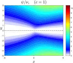 The solution describes a jet of fluid moving away from the origin rapidly and entraining the slowly moving fluid outside of the jet. The edge of the jet can be defined as the location where the streamlines are at minimum distance from the axis, i.e.,e the edge is given by