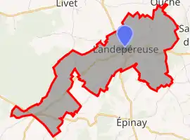 Landepéreuse is a small rural village in the Pays d'Ouche, located in the south-western Eure. Its surface is 892 hectares. Its maximum altitude change is 48 m but ranges between 187 m in the south-west and 139 m in the north-east; the town hall is at 170 m. This slightly undulating countryside is characteristic of the topography in the Pays d'Ouche, already hinted at in the hills of the Perche country to the south and the Pays d'Auge a few kilometres to the west. The landscape is made up of fields, pastures, orchards and woods. These are sometimes separated by hedges, mostly hawthorn or blackthorn (sloe).