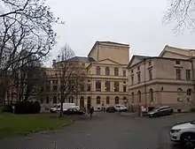 After the death of Friedrich III, Altenburg came to Duke Ernest II, Duke of Saxe-Gotha-Altenburg. In the former Schlossgartentheater,[2] operas and melodramas by the Gotha Hofkapellmeister Gottfried Heinrich Stölzel and Georg Anton Benda were performed, e.g. Benda's melodramas Ariadne auf Naxos and Medea in 1775. In terms of actors, Friederike Caroline Neuber[3] made guest appearances here for a long time around 1742 with her theatre company, and Konrad Ekhof from Gotha in 1775. In addition to plays by the young Lessing, plays by Diderot were also performed. When the theatre in the castle park was closed in 1779, there was an upsurge of civic initiatives: The stage in Pauritzer Gasse (1783-1842), later called "Altes Komödienhaus" (Old Comedy House), was converted by citizens of Altenburg from a barn into a "municipal theatre" with about 700 seats, including new types of stage equipment. Due to strong demand, mainly plays by Schiller were performed here. It was regularly visited by acting groups, e.g. in about 1818-1824 the company under theatre manager Sophie Walther and in 1820-1826 that of Carl Gerlach. The actor Carl Theodor Müller describes several engagements in Altenburg in his memoirs.[4]