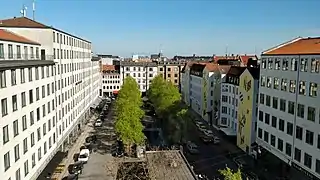 The building complex at Landgreven 3 / Store Kongensgade 27 dates from 1851. The building were refurbished by Tage Nielsens Tegnestue and Hans Munk Hansen (f.1929)) for Boligfonden Bikuben. The minimalistic murals on the two gables that face Landereven were at the same event created by the artist Ole Schwalbe.[4] The neighbouring building at Landgreven 7 / Borgergade 2-14 / Gothersgade 12-14 was built in 1943-1944 to design by Thorvald Dreyer.