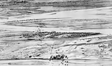 Three hundred and two aircraft from eight different airfields in the Moresby and Dobodura areas, made a rendezvous over Tsili Tsili at 10:07, flying through clouds, passes in the mountains, and over the top. "Not a single squadron," wrote General Kenney, "did any circling or stalling around but all slid into place like clockwork and proceeded on the final flight down the Watut Valley, turned to the right down the Markham, and went directly to the target."[34] Leading the formation were 48 B-25s from the 38th and 345th Bombardment Groups whose job was to "sanitise" the drop zones by dropping their loads of sixty 20-pound (9.1 kg) fragmentation bombs and strafing with the eight .50-calibre machine guns mounted in their noses. They were followed by seven A-20s of the 3rd Bombardment Group (Light).[32] Each carried four M10 smoke tanks mounted under the wings. The smoke tanks were each filled with 19 US gallons (72 l) of the smoke agent FS. In two groups of two and one of three flying at 250 feet (76 m) at 225 mph (362 km/h), they laid three smoke curtains adjacent to the three drop zones. The lead aircraft discharged two tanks, waited four seconds, then discharged the other two. The following aircraft went through the same procedure, creating a slight overlap to insure a continuous screen. Conditions were favourable, while the 85% humidity kept the screens effective for five minutes and stopped their dispersal for ten.[35]