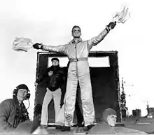 A landing signal officer or landing safety officer (LSO), also informally known as paddles (United States Navy) or batsman (Royal Navy), is a naval aviator specially trained to facilitate the "safe and expeditious recovery" of naval aircraft aboard aircraft carriers.[1] LSOs aboard smaller air capable ships that launch and recover helicopters are informally known as deck. Originally LSOs were responsible for bringing aircraft aboard ship using hand-operated signals. Since the introduction of optical landing systems in the 1950s, LSOs assist pilots by giving information via radio handsets.