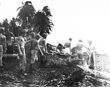 Following the first echelon, the 43rd Division's assistant commander, Brigadier General Leonard Wing, and Vice Admiral William F. Halsey, in command of the operation to secure New Georgia, waded ashore under sniper fire after their boat became grounded about 50 yards (46 m) from the beach.[26] The 2nd Battalion, 172nd Infantry Regiment established a defensive perimeter around the beachhead, but experienced trouble digging-in due to the heavily waterlogged ground. Eventually, they were forced to move their defensive lines to higher ground.[27] As the invasion progressed American supplies crowded the beaches as infantry pushed the Japanese defenders inland. The 9th Marine Defense Battalion, in addition to skirmishing with Japanese forces, began securing and clearing their predefined artillery position objectives and the Seabees from the 24th Naval Construction Battalion began clearing an encampment for a medical aid station.[28] The Seabees' work was hampered by sniper fire, while the heavy rain quickly turned the ground to mud which disrupted the movement of vehicles and heavy tractors that were tasked with dragging the heavy artillery pieces into position.[29]