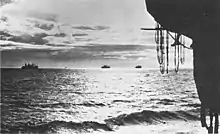 In response to the landing, Japanese artillery batteries based on Bangaa Island and around Munda then began shelling four US destroyers that were sailing through the Blanche Channel offshore from the landing beach. This shelling damaged the destroyer Gwin, killing three and wounding seven, before two other ships from the screen—Farenholt and Buchanan—began engaging the shore batteries, while the damaged Gwin obscured the transports with smoke to prevent them from being engaged.[30] A force of 27 Zeros from the 11th Air Fleet, undertook a fighter sweep over the beachhead just before noon, delaying the unloading of the US transports while Allied fighters engaged them, shooting down four.[31][32][33]