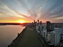![]() Langley Park, looking across the western end towards the Perth CBD. The dominant building on the right is the Federal Law Courts, the gardens in front include Government House and Supreme Court Gardens | |